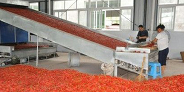 二、匡老五辣業(yè)除了有大型規(guī)范的種植基地外,同時配套了相應的3000多噸的標準化冷庫,以及處理烘干80多噸鮮椒的蒸汽烘烤流水線設(shè) 備,即能掌控辣椒的干度,又保證干辣椒色澤的均勻紅亮。